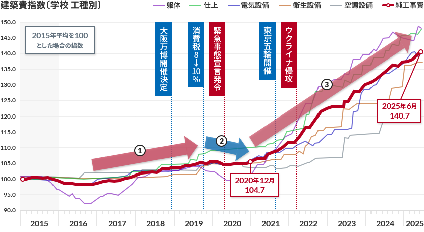 建設費は、2020年末から2025年6月までで、約34.4%のかつてない大幅な上昇となっており、今後も予断を許さない状況です。