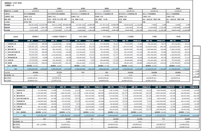 明豊FWは、教育施設整備における豊富な発注支援実績をもとに、実際の工事費情報を精緻に整理した「教育施設に特化した工事費坪単価データ」を整備しています。